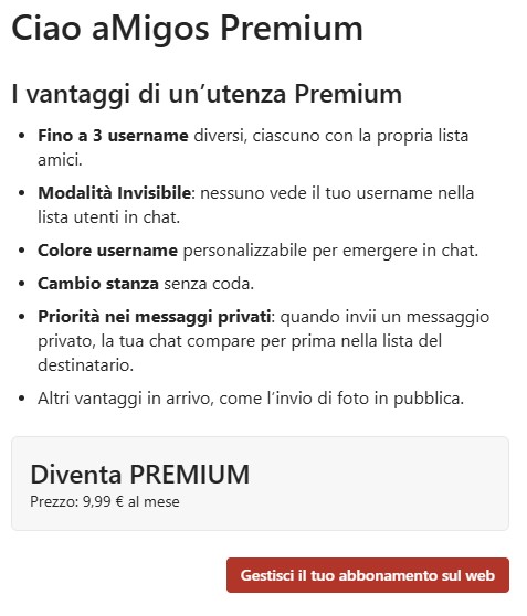 Per fortuna Ciaoamigos è rimasto sostanzialmente gratis ma è stata aggiunta una “modalità Ciao amigos premium” che prima non c'era.
