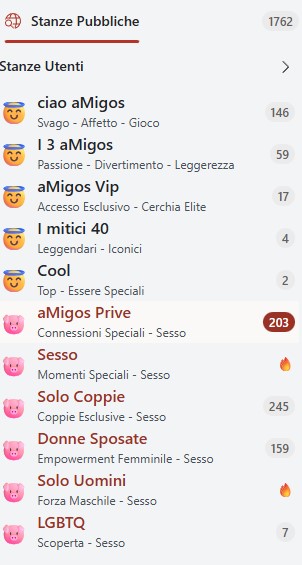 ciaoAmigos una chat per pesone con serie problemi di solitudine una chat ritrovo chi cerca trova ce di tutto la caccia e sempre aperta h24 chi modera spesso non riesce a valorizzare il tempo tra chat e famiglia vabbè meglio na chat amica che una famiglia in discordia
