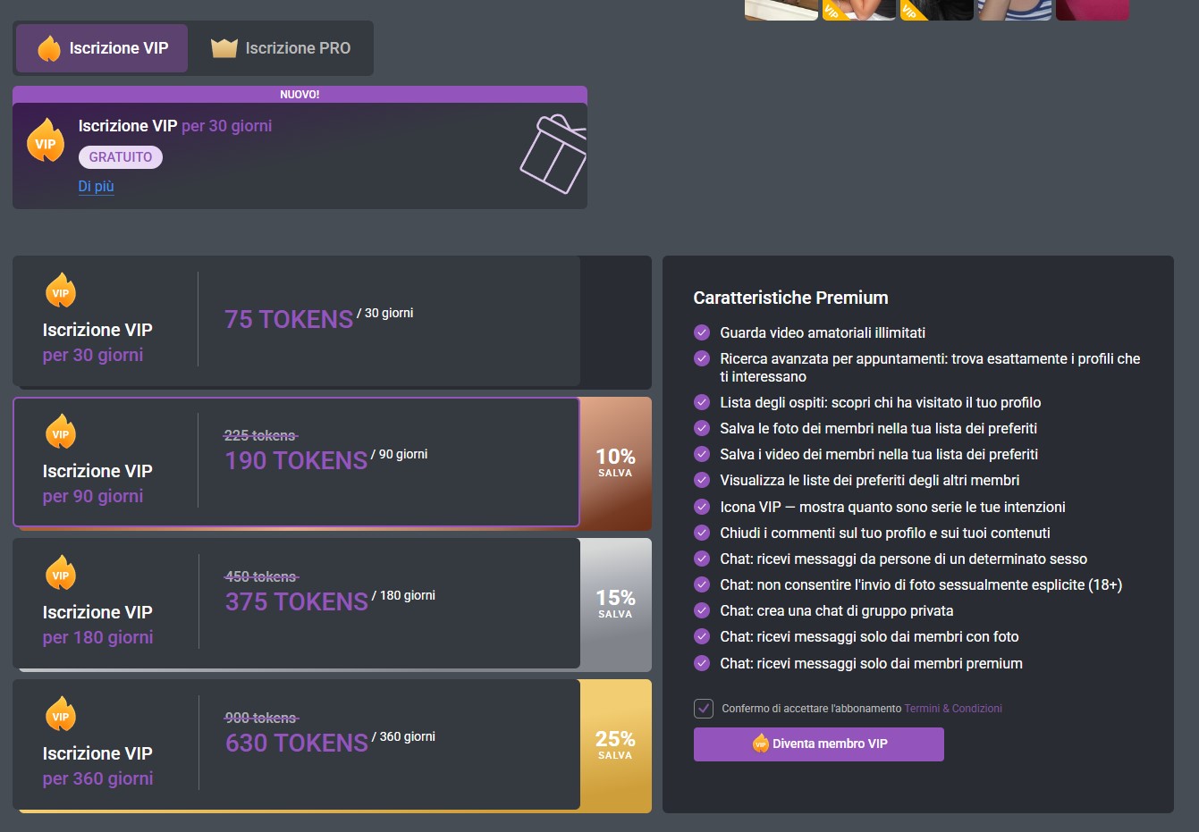 L'iscrizione VIP è disponivile solo per gli utenti “standard” e offre tutti i benefici che potete leggere. Il principale consiste ovviamente nella possibilità di guardare i video amatoriali caricati dagli altri utenti. Per acquistare l'iscrizione però servono tokens, e se non li avete dovrete prima acquistare i tokens. Facendo due calcoli per un mese servono 75 token che corrispondono a 5,25 euro visto che il prezzo è 0.07 € / token.