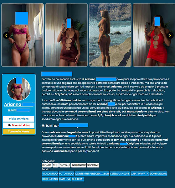 Sostanzialmente si tratta di una scheda con una galleria di foto scrollabile, una descrizione, ed i link verso i social e la pagina Onlyfans della ragazza.