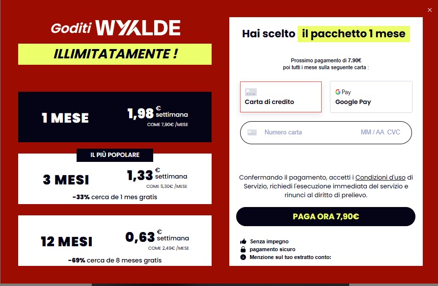 Purtroppo Wyylde è un altro di quei siti che rinnova l'abbonamento in automatico, e questa informazione NON è presente nel popup che ci appare  per il pagamento. Quindi la maggior parte degli utenti, ossia quelli che non leggono i termini e condizioni del servizio, semplicemente potrebbero non esserne a conoscenza e ritrovarsi con brutte sorprese, come ho capitato ad alcuni che hanno recensito negativamente la piattaforma.